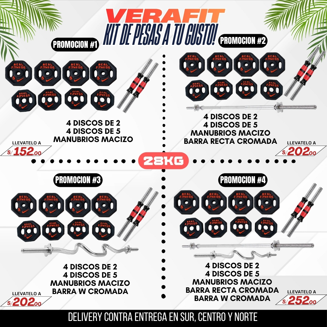 Lleva tu gimnasio a casa con nuestra línea VERAFIT. Te ofrecemos 4 opciones de kits versátiles y resistentes, diseñados para adaptarse a tus objetivos de entrenamiento. Todos nuestros kits incluyen un total de 28 kG en discos de alta calidad