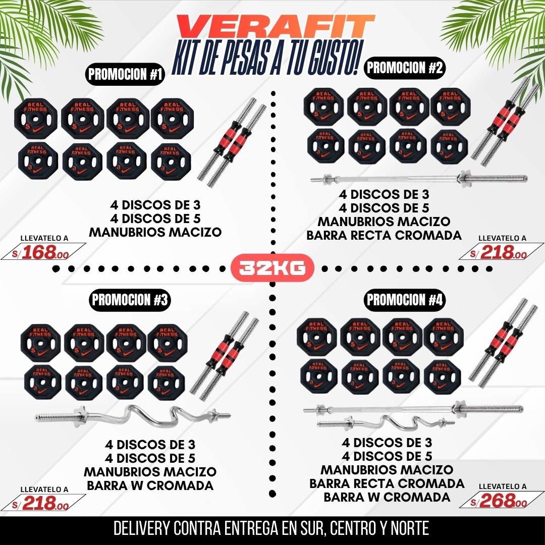 Lleva tu gimnasio a casa con nuestra línea VERAFIT. Te ofrecemos 4 opciones de kits versátiles y resistentes, diseñados para adaptarse a tus objetivos de entrenamiento. Todos nuestros kits incluyen un total de 32 KG en discos de alta calidad