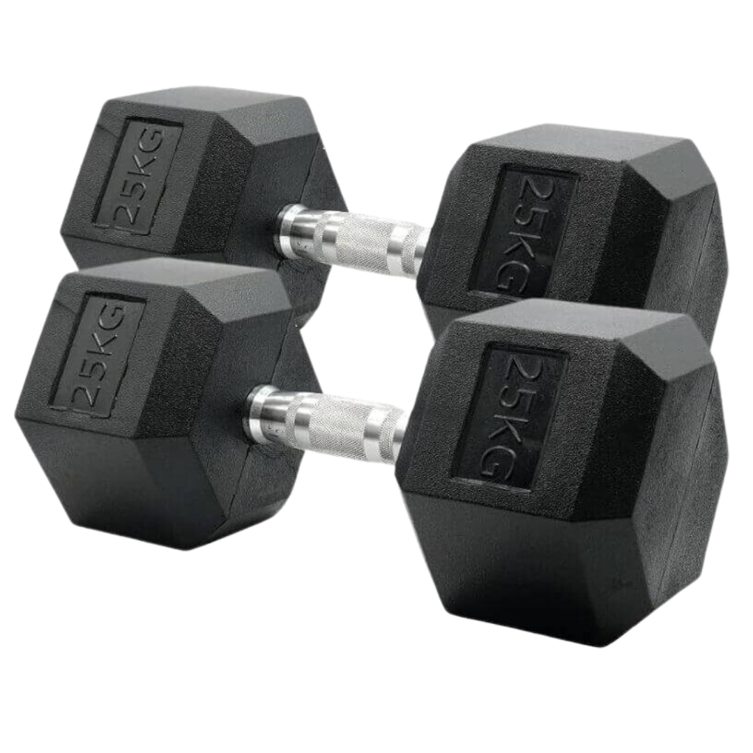 Mancuerna hexagonal de caucho de 25 kg, ideal para entrenamientos intensivos de fuerza y musculación avanzada.